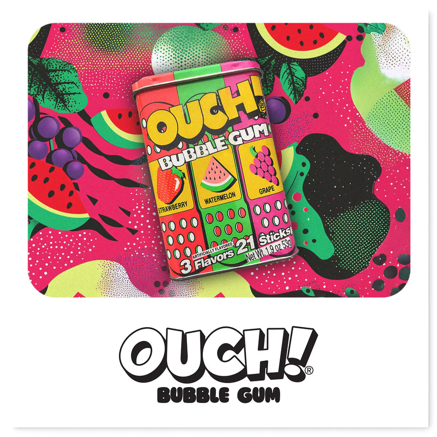 Introduced in the 1990s, Ouch! Bubble Gum quickly became a standout in the world of novelty gum with its unique bandage tin packaging and fruity stick gum. Designed to look like a pack of