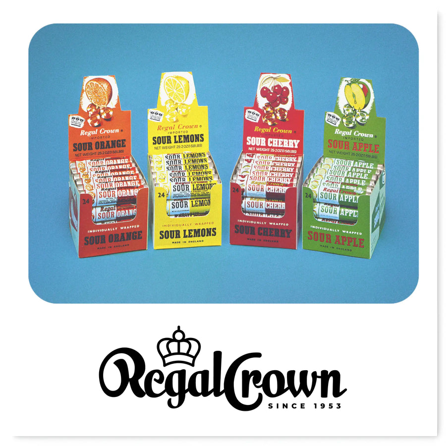 The brand offered a variety of bold, tangy flavors, including Sour Cherry, Sour Lemon, Sour Orange, Sour Apple, Sour Grape, Sour Raspberry, Sour Fruits, and Cool Mints. For decades, Regal Crown was manufactured in Maidstone - Kent, UK, until production moved to Granby, Quebec, in the 1970s.